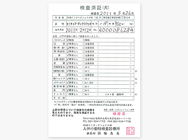 ウェルネスセンターでの検査を終えたワンちゃん・ネコちゃんに検査済証を発行します。