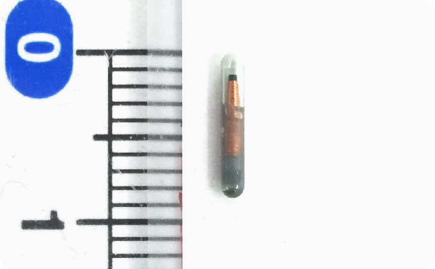 長さ約11~13.5mm×直径約2mmの細長いカプセル状で、中のICチップに固有の番号が記録されています。番号は、国コード、動物種コード、メーカーコード、個体番号から成る15桁。