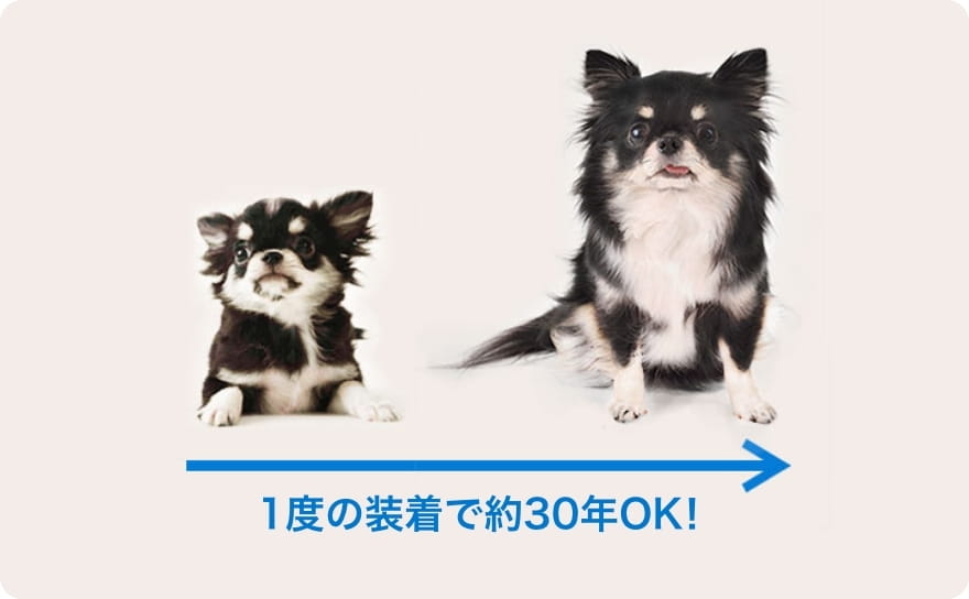 いえいえ、マイクロチップは予防接種と同じように注射で装着することができ、痛みもほとんどありません。傷も残らず、異物が入っている違和感もありません。1度装着すれば約30年は機能するので、ペットのIDを一生に渡って証明してくれます。