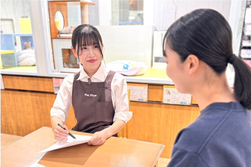 ペットプラスでは、ワンちゃん・ネコちゃんをお迎えいただく前に、お住まいの居住形態や生活スタイル、ペットと暮らすうえで知ってほしいことや大切なことなどを事前にカウンセリングさせていただいております。