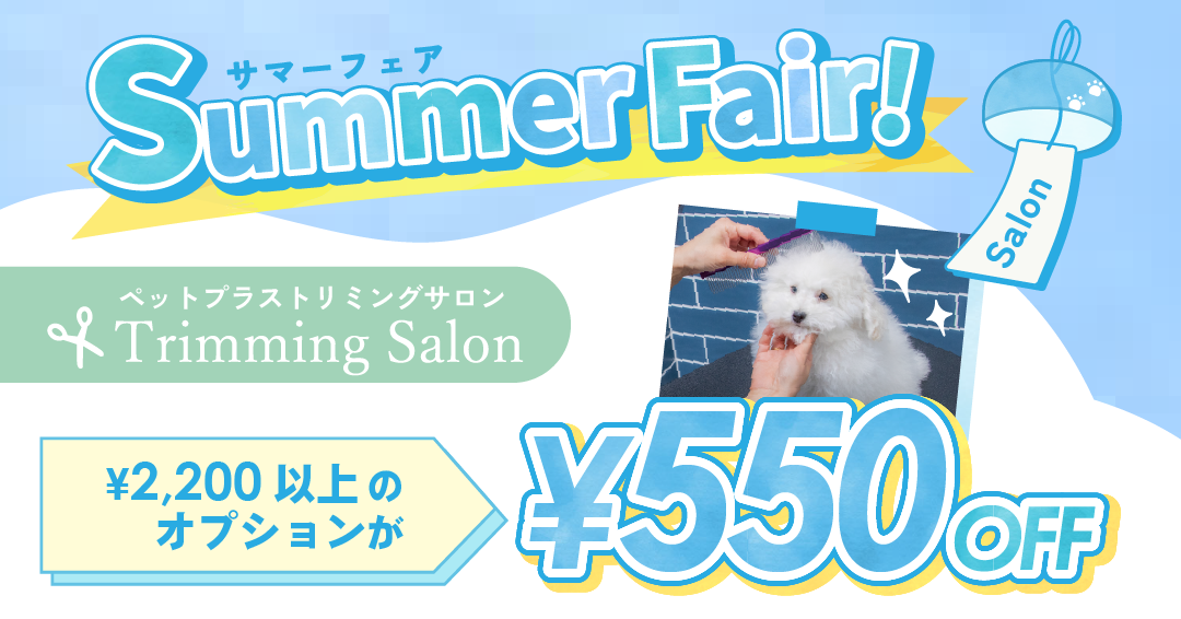 サマーフェア対象店舗に併設されている、ペットプラストリミングサロンでは、2,200円以上のオプションが500円off!事前にご予約の上ご利用くださいませ。